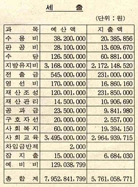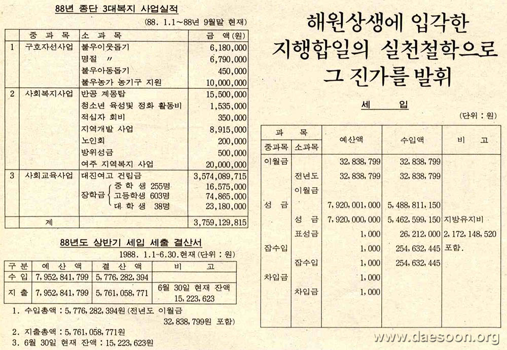 88년 6월 30일 현재, 총수입액 57억7천6백28만2천3백94원이고, 총지출액은 57억6천5만8천7백71원이며, 잔액은 1천5백22만3천6백23원이다.(별지 참조)