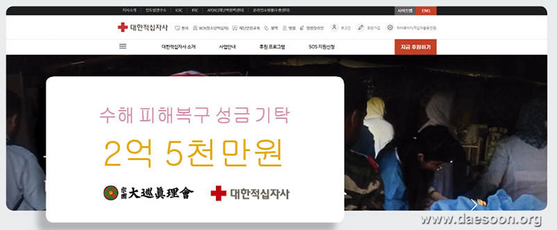 대순진리회에서 수해 피해복구 성금 2억 5천만 원(여주본부도장 1억 원, 성주 방면 1억 원, 포천수도장 5천만 원)을 대한적십자사를 통해 전달했다. 기부금은 올해 수해 피해가 발생한 충북, 충남, 경북 등 특별재난지역의 이재민ㆍ취약계층 지원과 복구 활동에 사용된다. |