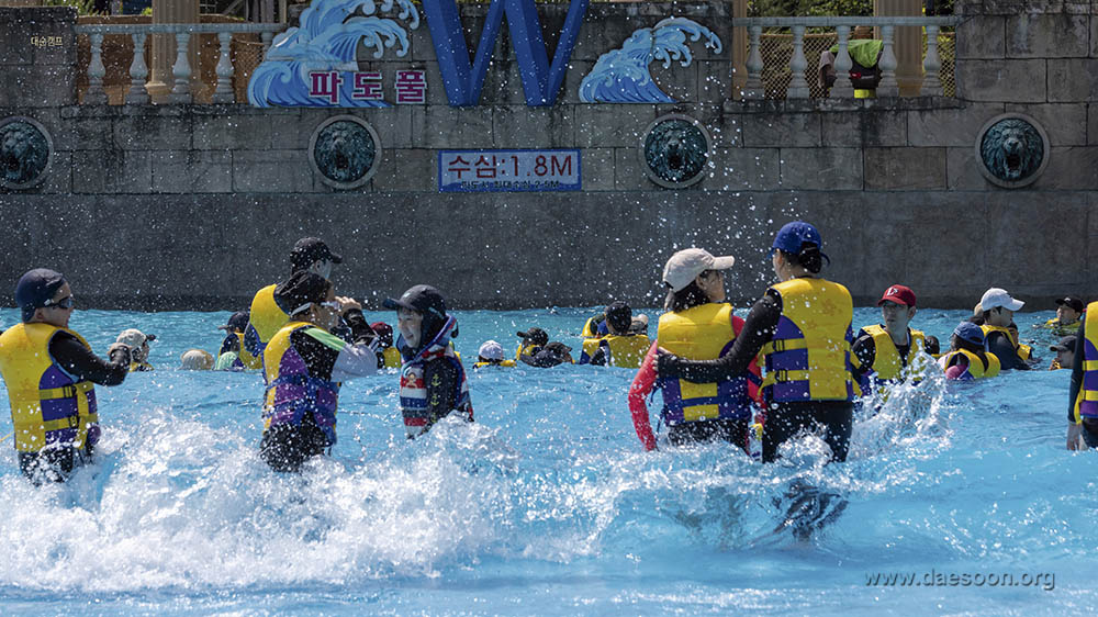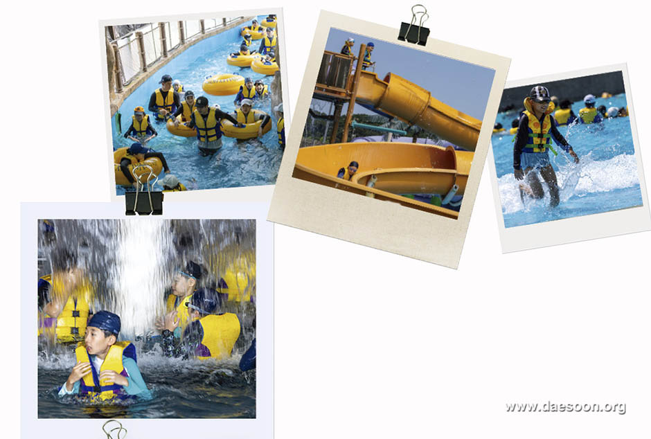 #시원한 워터파크로 떠나는 ‘외부체험활동’ 워터파크에서 자유시간. 아이들이 물에 들어가기 전 안전교육도 이뤄지지만, 아이들은 마냥 신이 난 표정이다. 친구들과 함께 어울리며 하계캠프만의 특별한 재미를 느껴보는 시간이었다. “선생님 물에 또 던져주세요”