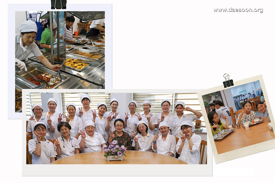 #즐거운 식사 시간 “감사히 잘 먹겠습니다.” 아! 기다리고 기다리던 식사 시간이다. 부녀회에서는 영양도 맛도 모두 주고 싶은 엄마의 마음으로 정성스레 식사를 준비한다. 아이들은 밥 먹기 전, 손도 깨끗이 씻고 줄을 서서 차례를 기다린다. 식당에 들어서며 부녀회 선생님들에게 하는 감사의 인사도 놓치지 않는다.