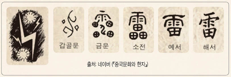 천둥 번개를 일으키는 구름은 대개 고온 다습한 공기가 불안정한 대기 속에서 강력한 상승기류를 형성하면서 만들어지는데, 적란운(積亂雲)이라 불리는 이 소나기구름은 수직으로 발달한 구름 덩이가 산이나 탑 모양을 이루며, 구름 하단은 지표로부터 2km 정도의 높이까지이나 구름 상단은 종종 10km 이상 이르기도 한다.05 이렇게 급속하고 강한 상승기류가 하늘 높이 수 km에 걸친 구름을 형성할 때, 상승기류 속의 수증기와 먼지는 미세얼음 알갱이와 마찰과 충돌을 일으키며 정전기를 발생시킨다.06 이때 양전하를 띤 입자는 구름 상단에, 음전하를 띤 전자들은 구름 하단에 모이며 뇌운(雷雲)을 형성하고, 이렇게 발생한 전기가 더 이상 견딜 수 없는 고압에 이르게 되면 서로 극성이 다른 구름과 구름 사이, 혹은 음전하가 몰려있는 구름 하단과 양전하로 대전(帶電)된 대지 사이에서 순간적으로 고압의 전류가 흐르며 방전(放電)하게 된다. 이것이 바로 번개이다. 번개는 30만 볼트 이상 최고 10억 볼트의 전압으로 엄청난 섬광과 태양 표면의 온도보다 약 4배 이상 뜨거운 27,000도에 이르는 고열을 발생시킨다.07 이때 고열에 의해 주변의 공기가 순간적으로 팽창하면서 일으키는 폭발음이 천둥이다. 천둥은 번개가 친 이후 불과 0.5초 만에 발생하므로 번개와 천둥은 거의 동시적으로 일어나는 현상이지만, 그것을 먼 거리에서 듣게 되기 때문에 소리가 전해지는 약간의 시간 차이로 인해 마치 별개의 두 가지 현상인 것처럼 느껴지기도 한다. 뇌(雷)라는 한자는 고대 갑골문과 금문(金文), 소전, 예서, 해서를 거치며 오늘날에 이르렀다. 갑골문과 금문에서 ‘雷’ 자의 중간에 나타난 곡선은 번개를 뜻하고, 번개 주위의 원은 천둥 칠 때 나는 거대한 소리를 의미하므로 ‘雷’라는 글자는 본래 천둥과 번개의 의미를 함께 가지고 있었다고 볼 수 있다.08 이후 금문에서부터 ‘비 우(雨)’ 자가 더해져 천둥과 번개가 함께 일어나고 비를 수반한다는 점이 표현되어 있는데, 이렇게 소나기구름인 뇌운 속에서 천둥 번개가 치며 내리는 비를 뇌우(雷雨)라 한다.