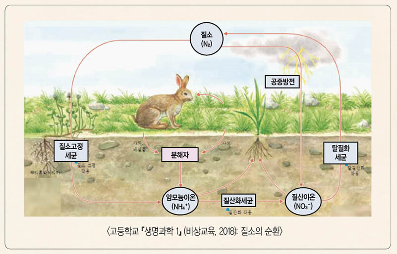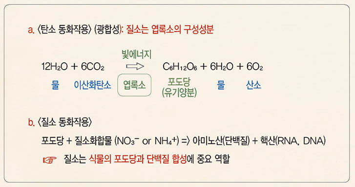 식물이 흡수한 질소를 바탕으로 유기물을 만드는 과정을 ‘질소동화작용’ 19이라 하는데, 이 과정에서 토양에서 흡수된 질소 무기화합물(NO₃- or NH₄+)은 광합성을 통해 만들어진 포도당과 함께 아미노산과 핵산이라는 질소 유기화합물로 합성된다. 이때 만들어진 아미노산은 단백질의 재료가 되고, 핵산(RNA, DNA)은 단백질 합성에 관여한다. 즉, 각 생물은 단백질 합성과 관련된 유전정보를 세포핵의 DNA(설계도면)에 저장하는데, 세포질에 있는 리보솜(ribosome, 단백질 합성기관)은 RNA로 하여금 이 설계 도면을 복사하여 필요한 때에 필요한 만큼의 단백질을 합성할 수 있도록 조절한다.20 이처럼 질소는 광합성(탄소동화작용)을 하는 엽록소의 구성성분이자 단백질 합성에 필요한 아미노산과 핵산을 이루며, 식물이 포도당(탄수화물)과 단백질을 합성하는 데 중요한 역할을 한다.