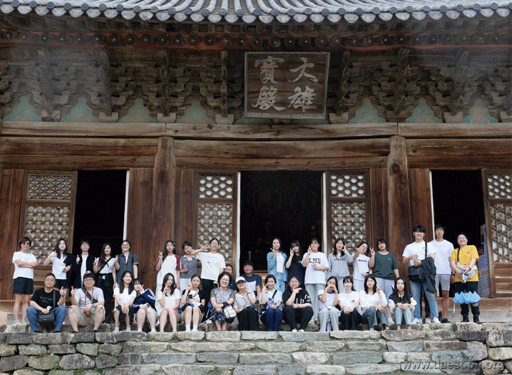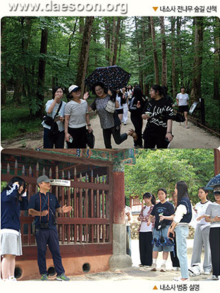일주문 앞에 있는 천년의 느티나무가 할아버지 당산나무다. 매년 1월 14일에 스님과 마을 사람들이 마을의 안녕과 풍요를 기원하는 제를 지낸다. 일주문부터 약 600미터가량은 우리나라 3대 전나무숲 중 하나라 불리는 내소사 전나무숲길로 비가 오락가락 했지만 상쾌하게 걷기 좋은 길이었다. 내소사는 전나무숲길, 대웅보전의 꽃살문 때문에 사람들이 많이 찾는다. 중간에 멈춰 전나무에 관한 학생의 발표를 들었다. 이어 걸으니 단풍나무 가로수길에 곧바로 천왕문이 나왔다. 또 커다란 느티나무가 시선을 붙잡았으니 할머니 당산나무로 여기서도 제를 지낸다. 그 왼편에 고려 동종 복제품이 있었다. 밀랍주조공법으로 실물과 똑같이 만들었다고 하니 실물을 못 봤어도 아쉽지 않았다. 학생의 발표와 더불어 교장 선생님이 맥놀이와 관련된 한국 종의 특징을 설명했다. 법당 안 부처님께 예를 표하고 대웅보전 꽃살문에 관해 준비한 학생의 발표를 들었다. 불상 뒤로 가면 백의관음을 볼 수 있다는 교장 선생님의 안내에 몇몇 선생님들과 학생들이 직접 보러 불당 안에 들어갔다.