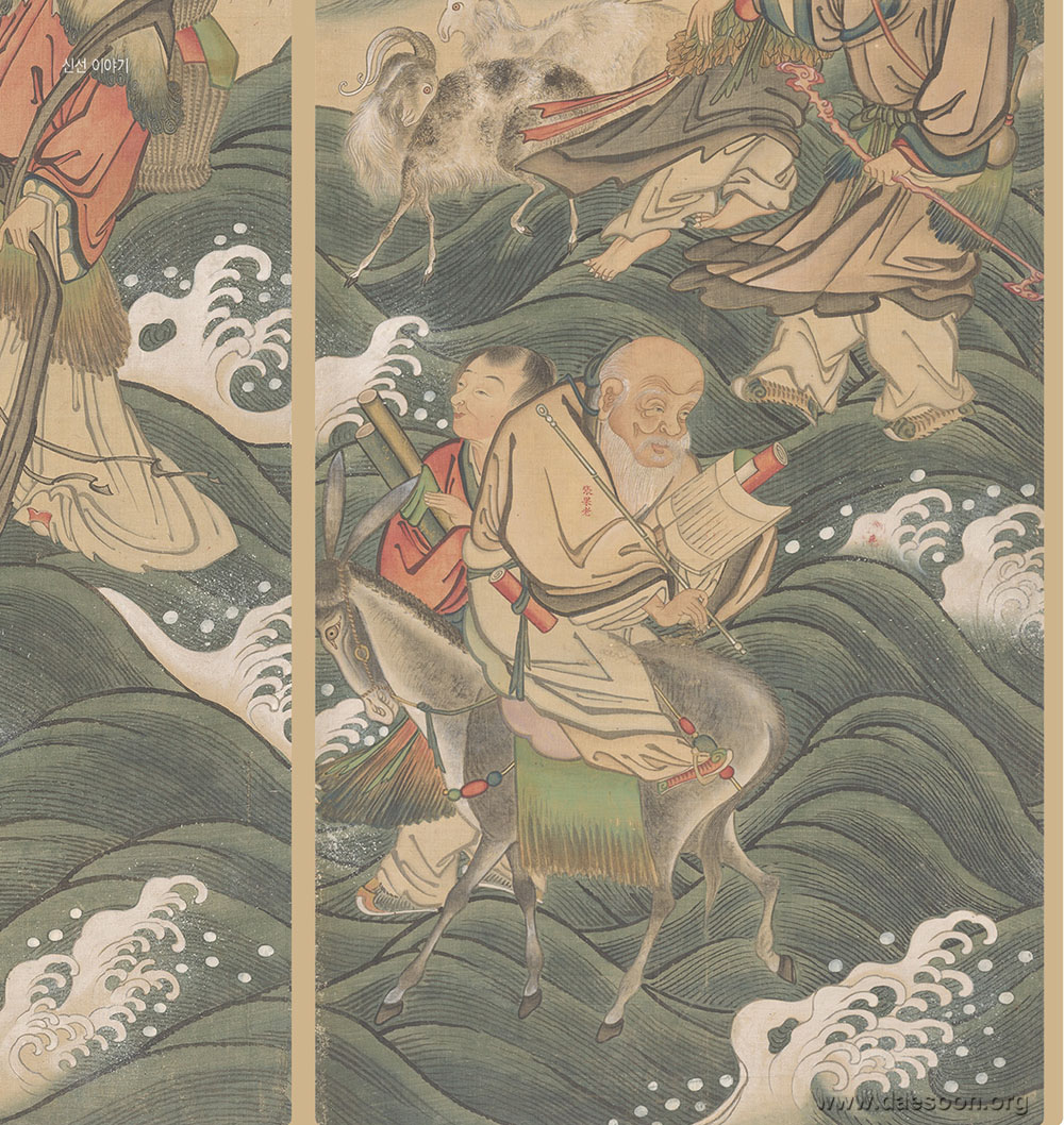 「팔선도」에서 나귀를 거꾸로 타고 가는 노인을 본 적이 있는가? 그는 팔선 중 가장 나이가 많은 장과로(張果老)다. 그는 당대(唐代)의 도사로 원래 이름은 장과(張果)다. 늙을 노(老)자는 후세 사람들이 존칭으로 붙여 주었다고 한다. 오랫동안 항주(恒州)의 중조산(中條山)에 은거하며 산서(山西)성 일대에서 수도하였다. 그의 모습은 나귀를 거꾸로 탔거나 혹은 어고간자(魚鼓簡子: 죽통)를 든 늙은 도사로 묘사된다. 장과로는 늘 흰 나귀를 타고 다녔는데, 하루에 만 리를 간다고 한다. 나귀를 타지 않을 때는 접어서 보관했는데 나귀는 순식간에 얇은 종이로 변했다. 접어서 조그마한 종이 한 꾸러미가 되면 두건 상자 속에 넣고 다닐 수 있었다. 나귀를 탈 때면 종이에 물을 뿌려 살아 있는 나귀로 만들었다. 그는 나귀를 거꾸로 타고 천하를 주유하며 다녔다. 당시 사람들은 어렸을 때 장과로를 자주 보았고, 노인이 된 후에도 종종 보았기에 그가 장생불로의 비술을 몸에 지녔다고 생각했다. 호흡 수련에 능한 도사였던 장과로는 내단을 위주로 하여 내단법의 요체를 밝혔으며, 그의 호흡법과 내단 사상은 송원(宋元) 내단학의 선구로 여겨진다. 훗날 그는 팔선 중 한 신선으로 추앙받으며 ‘노(老)’를 대표하는 신선으로 자리매김했다. 장과로에 관한 최초의 기록은 당대 정처회(鄭處誨)가 저술한 『명황잡록(明皇雜錄)』에서 찾아볼 수 있다. 여기에는 당 현종과의 일화들이 기록되어 있는데 각종 변화무쌍한 이적을 행하는 도사로 등장한다. 또 다른 기록인 『신당서(新唐書)』에는 도교를 불신했던 당 현종이 장과로를 만나면서 바뀌는 심리상태를 잘 묘사하고 있다. 송대에 이르러 민간에 전설과 민담들이 발전하면서 그에 관한 이야기는 더욱 다채로워졌다.