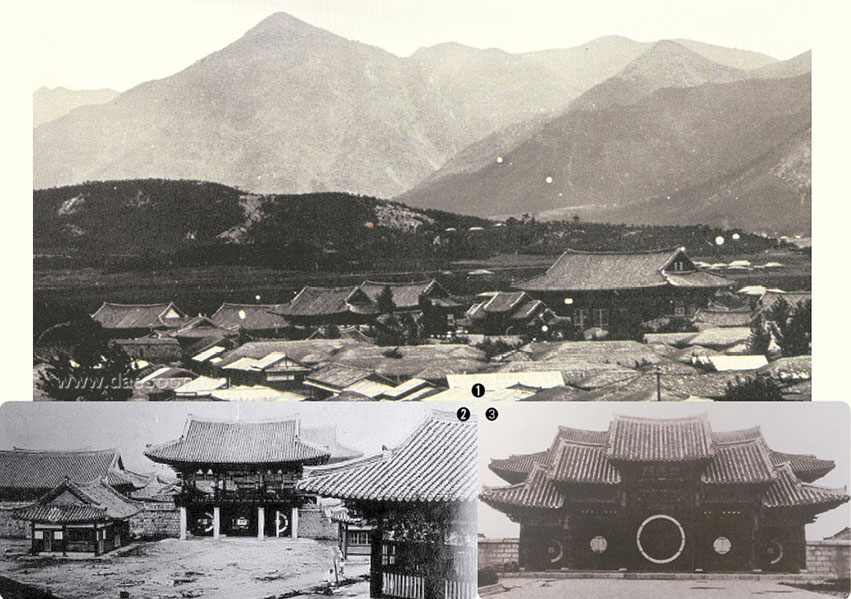 ➊ 당시의 보천교 중앙교당과 대흥리 (출처: 일본 동경 학습원 대학 우방문고 소장) ➋ 당시의 보천교 보화문 ➌ 당시의 십일전의 삼광문 (출처: 『朝鮮の類似宗敎』)