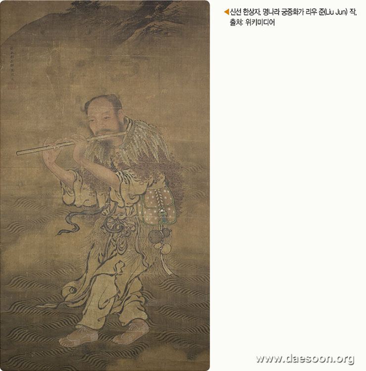 「팔선도」에서 피리를 들고 있는 미장부(美丈夫)가 한상자(韓湘子)다. 그의 이름은 상(湘)이고 자는 청부(淸夫)다. 후세 사람들이 이름자 뒤에 자(子)를 붙여 한상자라고 불렀다. 당대(唐代) 명문장가로 유명한 당송팔대가(唐宋八大家) 중 한 사람인 한유(韓愈)의 조카라고 전해진다. 한상자는 선골을 타고났으며 그 품성이 세속 사람과 크게 달랐다. 번화하고 화려한 것을 싫어하고, 담백하고 청아한 것을 좋아하며 심지가 곧았다. 그의 아버지 한회(韓會)는 한상자가 어린 시절부터 유달리 총명한 것을 알았다. 동생 한유에게 “이 아이는 타고난 재질이 뛰어나 장래 큰 재주를 이룰 수 있을 것이다. 선생을 초청해 공부시키는 게 어떻겠는가?”라고 물었다. 한유는 사방에 수소문하여 훌륭한 스승을 모셔 조카에게 학문을 전수케 하였다. 그러나 한상자는 태어나면서부터 전생의 지혜를 가진 듯, 어떤 경서(經書)를 막론하고 한 번 보기만 하면 암송하였고 선생의 도움이 없어도 그 깊고 현묘한 이치를 깨달았다. 12살이 되던 해, 이미 이름난 스승들을 여럿 거치자 신동이라는 소문이 수백 리에 퍼졌다. 그러나 그는 다른 부유한 집안의 자제들과 달리 관직에 들어갈 생각이 없었다. 대신 그는 주변의 산을 올라 피리를 연주하며 자연과의 교감을 갈망했다. 그는 어린 시절부터 꽃이 피고 지는 것을 보고 “모든 생명은 변화의 흐름 속에 있다”라고 말하곤 했는데, 이때부터 이미 도의(道義)에 눈을 떴다고 한다.